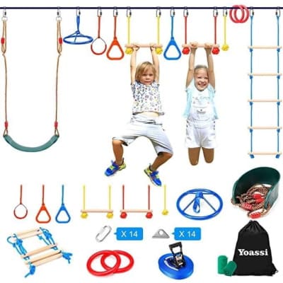 This 50FT Ninja Warrior Slackline with Swing, Rope Ladder & Ninja Hanging Wheel is HALF OFF with code 4FQGMFT8 at checkout!