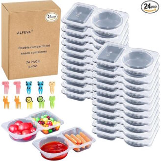 Grab this 24-pack of Reusable Double Compartment Snack Containers — complete with lids, mini forks, and dipping sauce cups!