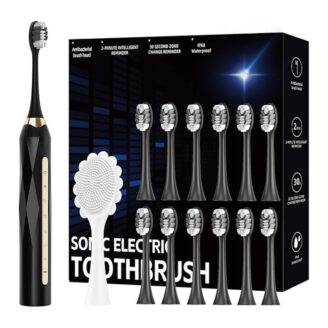 This set comes fully loaded with 12 brush heads (4 years of use!) + a face massage head 🙌. With 5 cleaning modes, 42,000 VPM motor, 2-minute timer, and up to 90 days battery life on a single charge — it’s basically a dentist-approved upgrade for your bathroom.