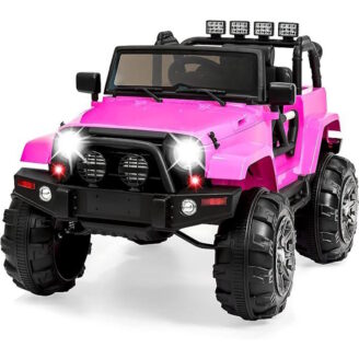 12V electric ride-on Jeep with parent remote control, seat harness, lights, and spring suspension.