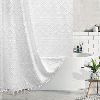 This gorgeous textured boho shower curtain is dropping 40% off at checkout đź‘€ Such an easy way to make your bathroom look high-end for way less!